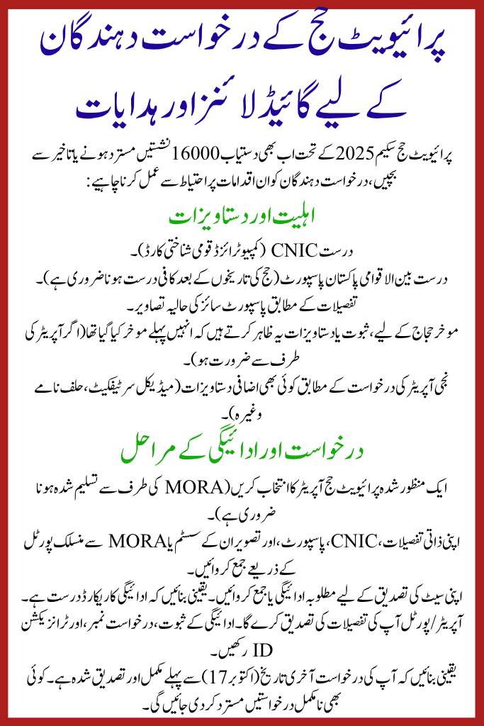 | Private Hajj Scheme 2025 | Sep 19, 2025 (approx) | October 17, 2025 | ~ 16,000 seats remain (out of 60,000) | Online via MORA / Private Hajj operators |