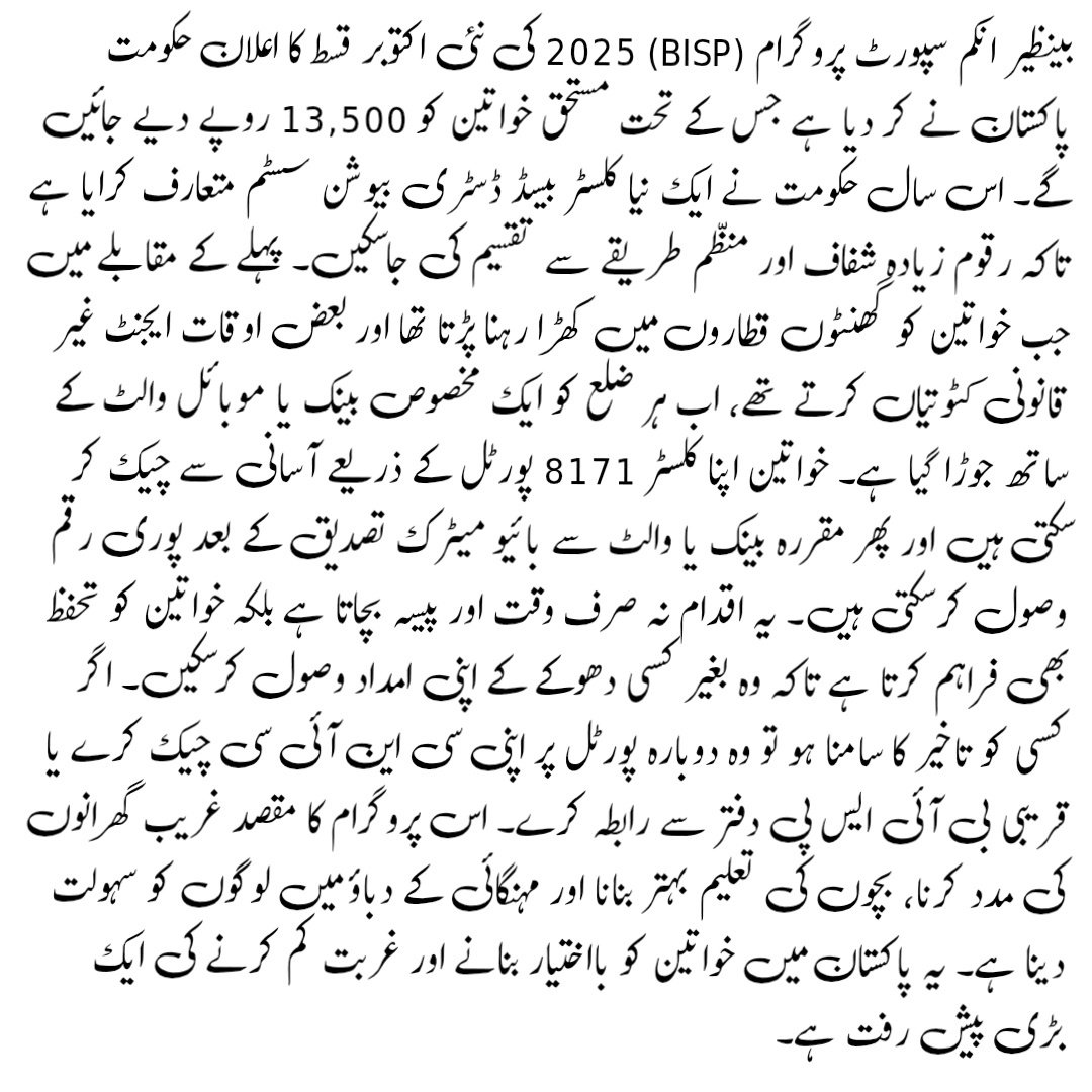 The BISP 2025 October Payment Schedule with the new cluster system is a groundbreaking step for transparency and fairness. Eligible women can now check their cluster online, wait for official SMS alerts, and collect their Rs. 13,500 safely without fraud or deductions. For unregistered families, applying through the NSER survey ensures inclusion in future cycles. 🔴 Read More