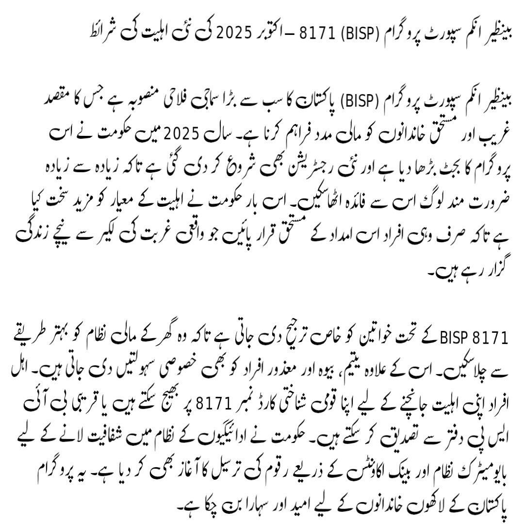 The updated BISP 8171 eligibility criteria for October 2025 ensure that only the most deserving families benefit from the program. With easier verification options, increased transparency, and broader reach, the government is taking a strong step toward reducing poverty in Pakistan. This initiative continues to serve as a lifeline for millions of families, empowering them with dignity and financial stability.
