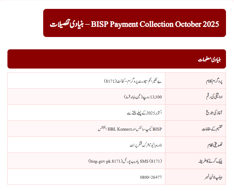 Under this October 2025 installment, each eligible woman will receive Rs. 13,500. Payments are being distributed through official BISP campsites and HBL Konnect agents, ensuring transparency, safety, and easy access for all beneficiaries.