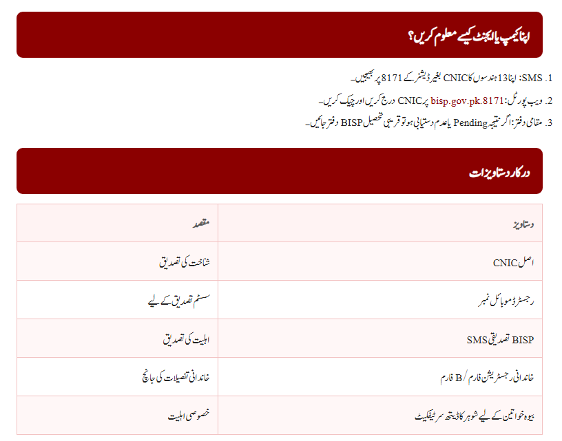 | Check Status | SMS (8171) / Portal (8171.bisp.gov.pk) |