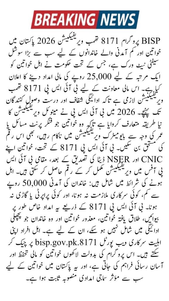 The BISP Program 8171 is Pakistan’s largest social safety initiative, providing financial assistance to low-income families, particularly women. In 2026, the government announced a one-time payment of Rs.25,000 for eligible beneficiaries who complete the BISP thumb verification or alternative verification process. This ensures transparency, prevents fraud, and delivers funds to the right recipients, especially widows, divorced women, and disabled women.