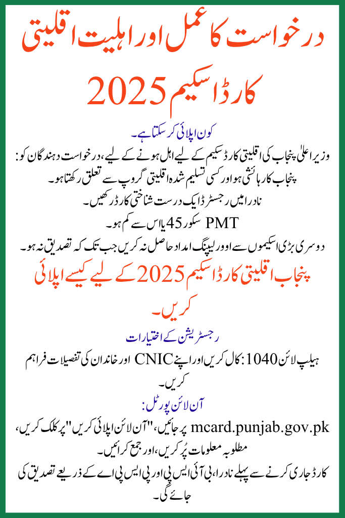 Apply online at mcard.punjab.gov.pk or call 1040.