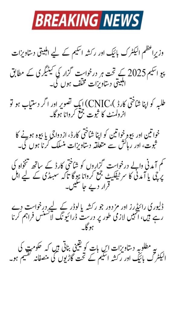 The eligibility documents for each applicant depend on their category under the PAVE Scheme 2025. Students must provide their CNIC, a photograph, and proof of enrollment if available. Women and widows must attach their CNIC, proof of marital or widow status, and residence documents. Low-income applicants need to submit their CNIC, salary slip, or income certificate to qualify for subsidies. Delivery riders and laborers applying for rickshaws or loaders must provide a valid driving license. These documents required ensure fair distribution of vehicles under the government’s electric bike and rickshaw scheme.