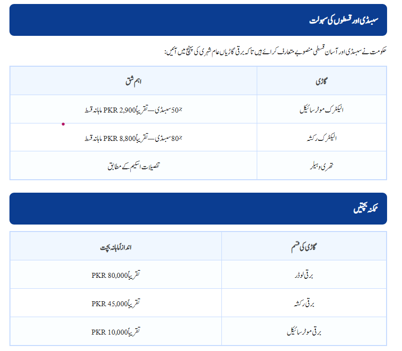 - Electric Rickshaw: 80% subsidy — approx. PKR 8,800/month