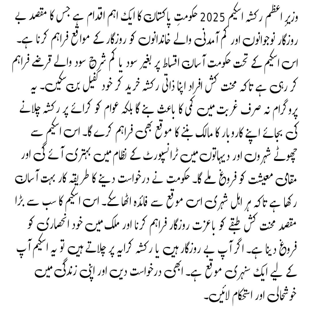 The PM Rickshaw Scheme 2025 is a life-changing opportunity for the unemployed and underprivileged citizens of Pakistan. With easy online application, no heavy interest, and affordable installments, it helps thousands of people build their own income stream and live a dignified life. If you are looking for stability and independence, this scheme could be your path to success.