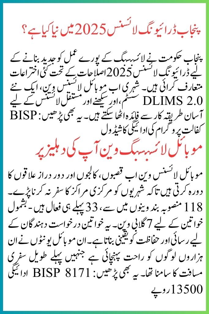 The Punjab government has rolled out several innovations under the Driving License 2025 reforms to modernize the entire licensing process. Citizens can now benefit from mobile license vans, a new DLIMS 2.0 system, and easier procedures for learner and permanent licenses. Also Read: BISP Kafalat Program Payment Schedule