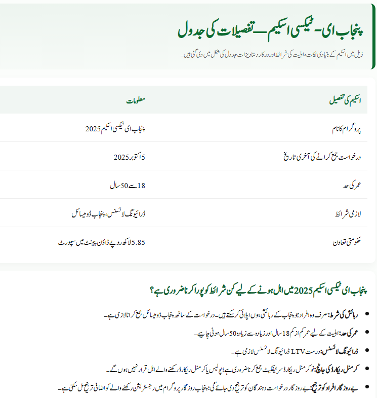 The Government of Punjab has introduced a golden opportunity for the youth under the Punjab E-Taxi Scheme 2025. Through this scheme, thousands of individuals will be able to earn a livelihood by owning and operating their own taxi. However, certain eligibility conditions have been set so that only genuine and deserving applicants benefit from it. This article will guide you step by step on who is eligible, who is not, and what documents are required. By the end, you will be able to check your eligibility and prepare everything before applying.